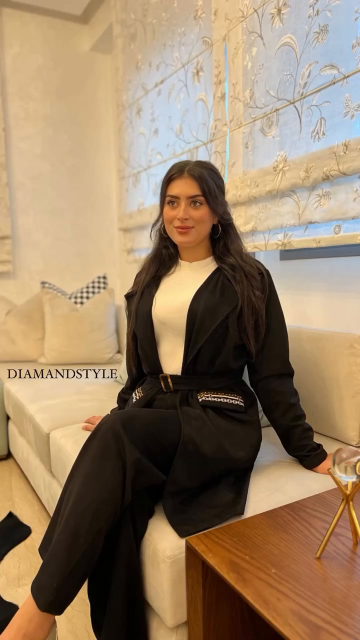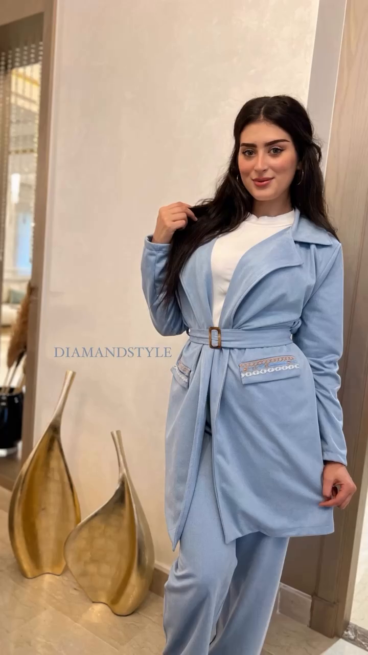 جاكيت مع حزام لتحديد الخصر، مع بنطال واسع يعطيك مظهرًا أنيقًا ومتناسقًا.